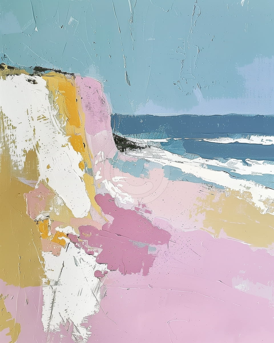 Dieses Gemälde zeigt eine Küstenlandschaft mit einer kräftigen Mischung aus Pastell- und Erdtönen. Eine große weiße und gelbe Klippe steht links und geht in eine weite rosa Fläche über. Das Meer im Hintergrund ist tiefblau mit weißen Wellen, die ans Ufer schlagen. Der Himmel ist in ruhigem Hellblau gemalt und bildet einen Kontrast zur strukturierten Fläche darunter. Die Pinselstriche sind dick und ausdrucksstark, was der Szene einen abstrakten, aber erkennbaren Charakter verleiht.
