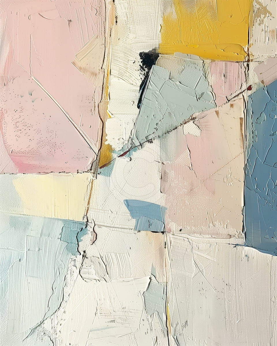 Dieses Gemälde besteht aus geschichteten geometrischen Blöcken in sanften Tönen von Rosa, Gelb, Blassblau und gebrochenem Weiß. Die Oberfläche ist stark texturiert mit dicken Strichen und sichtbaren Erhebungen, die mit dem Spachtel erzeugt wurden. Schwarze und ockerfarbene Linien trennen einzelne Bereiche und verleihen der Komposition Bewegung. Die überlappenden Formen variieren in Größe und Ausrichtung und erzeugen Tiefe und Rhythmus im abstrakten Aufbau. Die Farbpalette ist ruhig und hell mit einer natürlichen, greifbaren Wirkung.