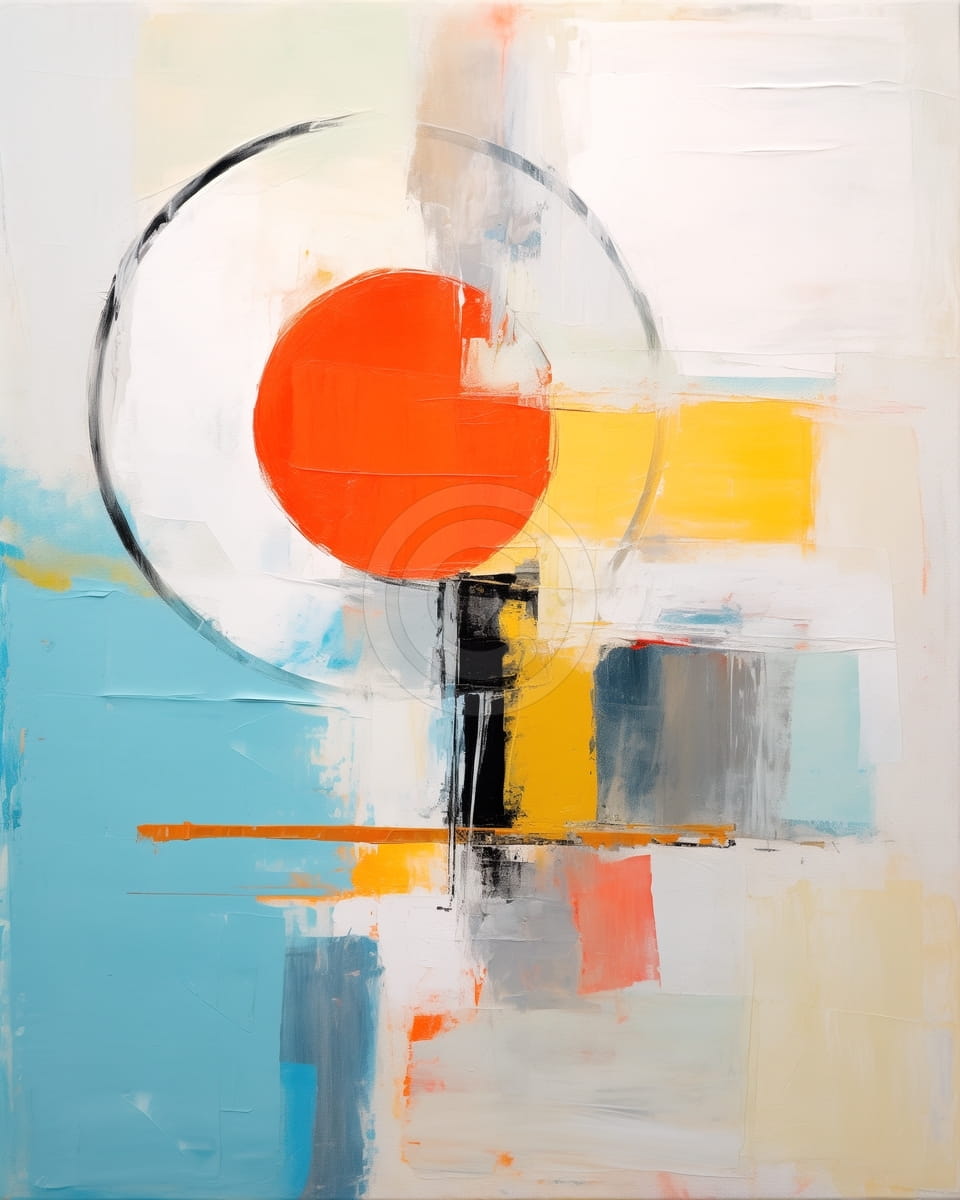 Dieses Gemälde zeigt einen kräftigen roten Kreis, leicht aus der Mitte verschoben und von einer lockeren schwarzen Kreislinie umgeben. Rundherum befinden sich abstrakte geometrische Blöcke in Gelb, Blau, Weiß, Grau und Schwarz. Der Hintergrund ist überwiegend weiß und in hellen Tönen gehalten, was für Raum und Kontrast sorgt. Eine horizontale orangefarbene Linie durchzieht die untere Hälfte und bringt Balance. Die Pinselstriche sind schichtweise und strukturiert, was der Komposition eine dynamische, moderne Wirkung verleiht.