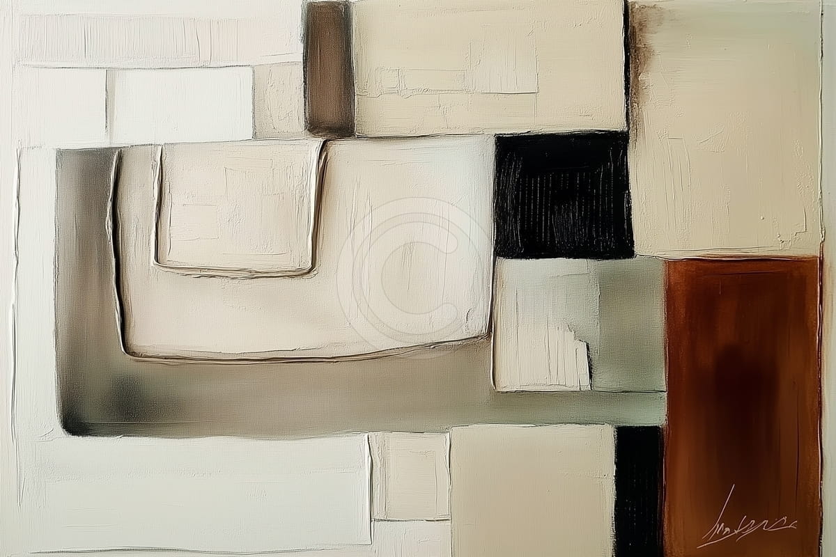 Dieses abstrakte Gemälde spricht in leisen Geometrien—ineinander verschachtelte Rechtecke in Creme-, Asche-, Siena- und Schwarztönen schaffen einen Rhythmus aus Form und Leere. Die Komposition wirkt bewusst und zugleich intuitiv, wie ein vergessener Bauplan, den die Zeit geglättet hat. Feine Texturen verleihen den flachen Flächen Tiefe und lenken den Blick auf Wege, die sich biegen, aber nicht brechen. Ein Bild stiller Ausgeglichenheit, in dem Struktur zur Innenschau wird.