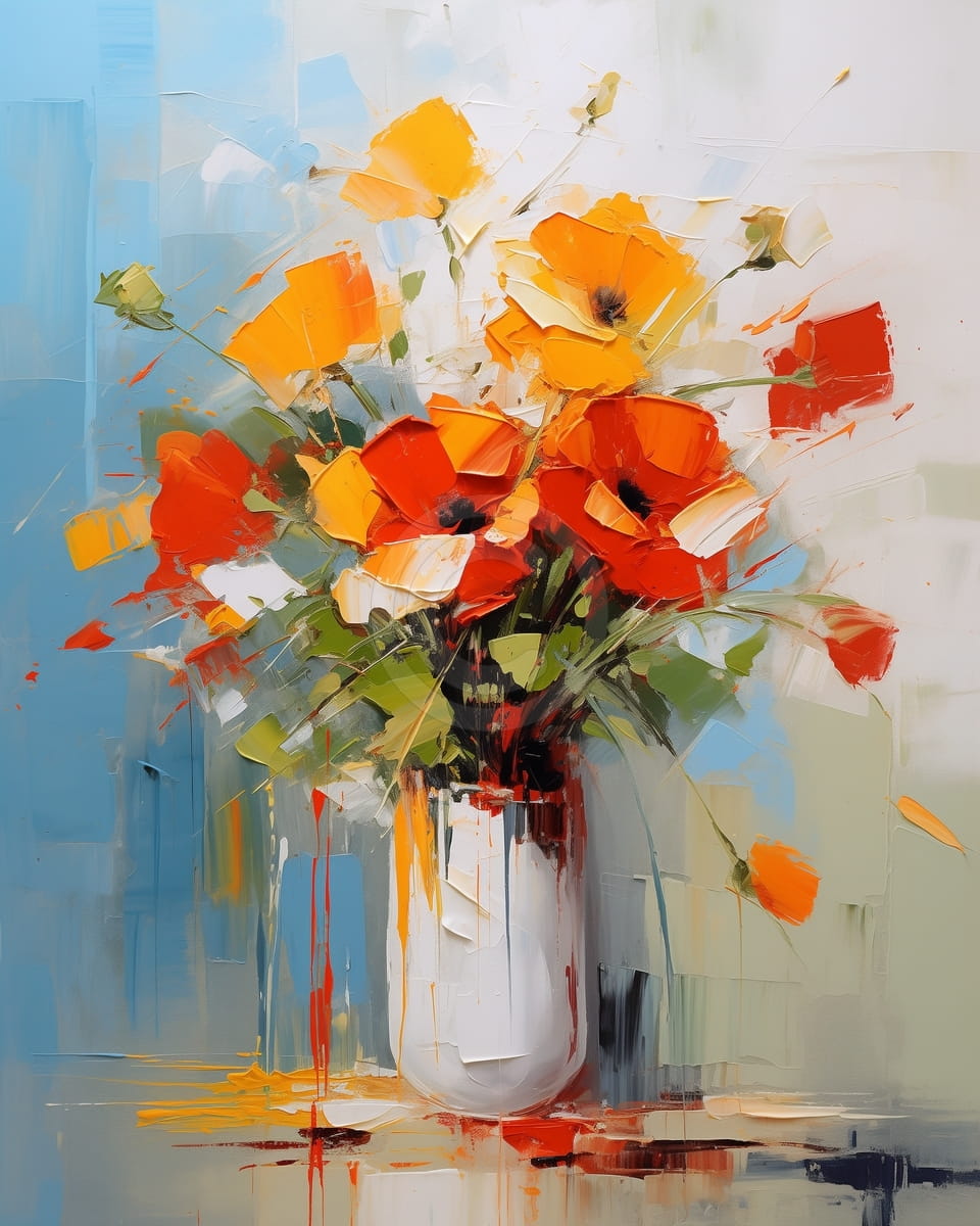 Dieses Gemälde zeigt einen lebendigen Strauß roter und gelber Blumen in einer hohen weißen Vase. Die Blütenblätter sind mit dicken, ausdrucksstarken Pinselstrichen gemalt, die der Komposition Struktur und Energie verleihen. Die grünen Blätter stehen im Kontrast zu den warmen Farbtönen der Blumen, während der Hintergrund sanftes Blau und Weiß mischt. Farbverläufe und kräftige Spuren am Vasenboden sorgen für eine moderne, dynamische Wirkung. Das Bild strahlt Wärme, Frische und eine starke florale Präsenz aus.