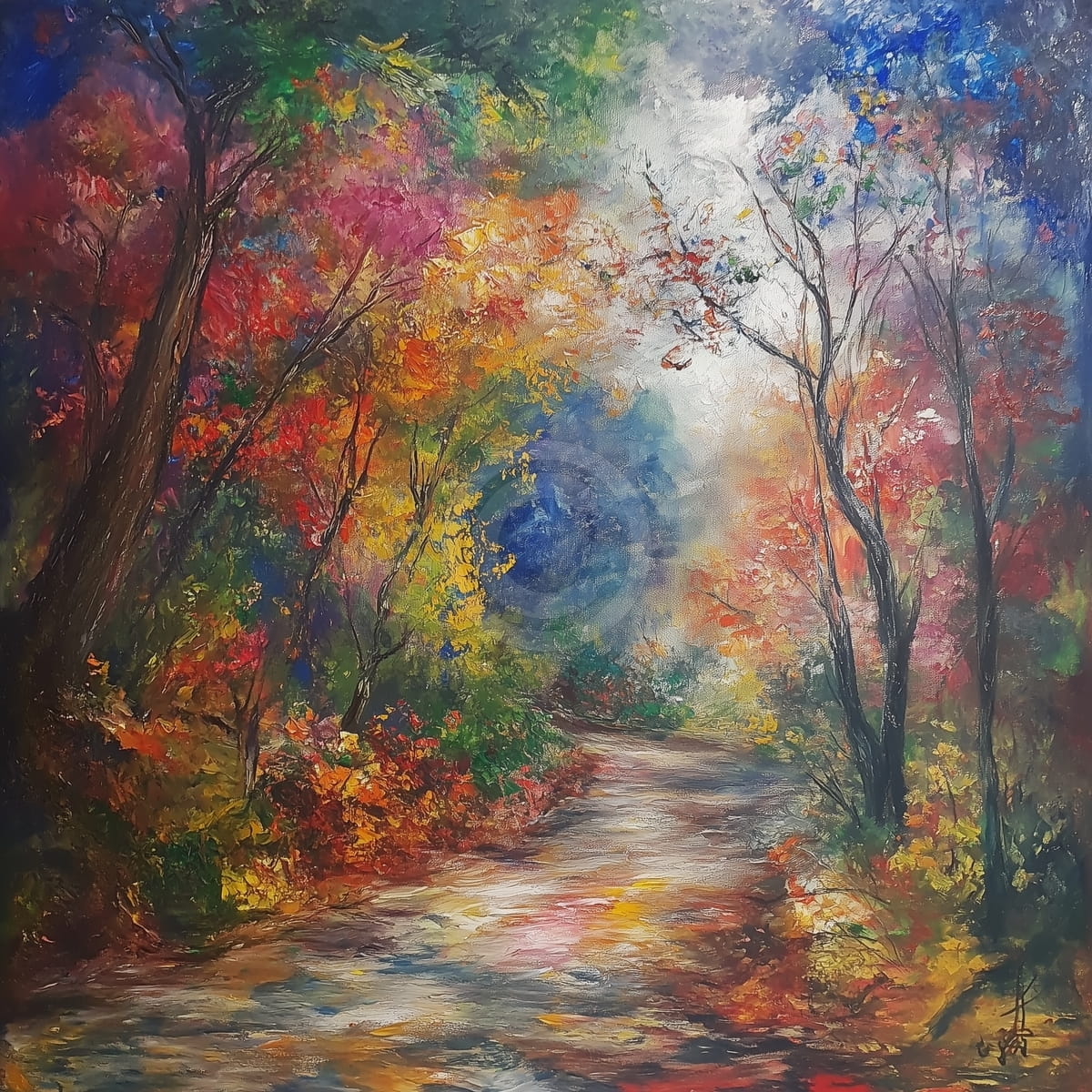 Das Gemälde zeigt einen Waldweg, umgeben von Bäumen in voller herbstlicher Pracht, mit lebhaften Tönen von Rot, Orange, Gelb, Grün und Akzenten in Blau und Violett. Der Weg schlängelt sich sanft durch den Wald, beleuchtet vom Licht, das durch das Blätterdach fällt. Kräftige, strukturierte Pinselstriche verleihen dem Laub Tiefe, während die zentrale Lichtung in einem sanften, nebligen Licht leuchtet. Der Kontrast zwischen dunklen Schatten und leuchtenden Blättern erzeugt Bewegung und natürliche Energie. Es fängt den lebendigen Geist eines farbenfrohen Herbsttages im Wald ein.