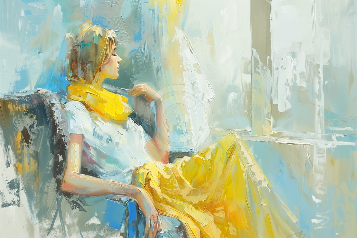 Dieses Gemälde zeigt eine Frau, die auf einem Stuhl nahe am Fenster sitzt. Sie trägt ein weißes Oberteil, einen gelben Schal und einen langen gelben Rock. Ihr Blick ist nach draußen gerichtet, und ihre Haltung ist entspannt. Der Hintergrund ist in hellen Blau-, Weiß- und Gelbtönen gemalt, was eine helle und luftige Atmosphäre schafft. Die Pinselstriche sind locker und ausdrucksstark mit sichtbarer Textur. Das Licht vom Fenster beleuchtet sanft ihr Gesicht und ihre Kleidung.
