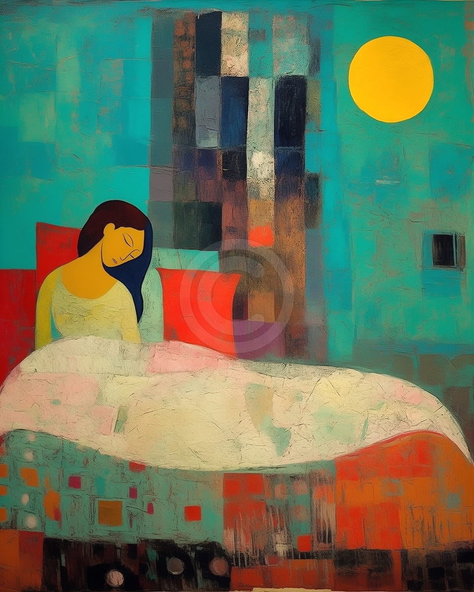 The painting portrays a woman with dark hair resting in bed, her head gently tilted to the side, eyes closed. The bedding and background are composed of abstract geometric shapes in warm reds, turquoise, teal, and soft creams. A bright yellow circle representing the moon glows in the upper right corner, contrasting against the calm night palette. The scene combines flat color blocks and textured patterns to evoke a sense of quiet and stillness. It blends abstract art with a feeling of intimate tranquility.