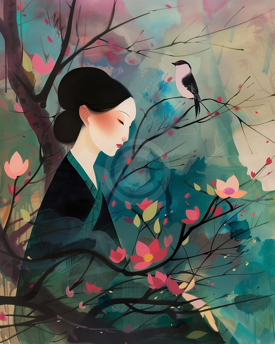 The painting shows a serene woman with her eyes closed, surrounded by dark branches blooming with pink flowers. A small bird perches on a twig nearby, adding a gentle presence to the peaceful scene. The background is filled with soft pastel tones and watercolor textures in teal, pink, and cream. Her dark hair and robe contrast elegantly with the delicate environment. The overall composition conveys quiet contemplation and harmony with nature.