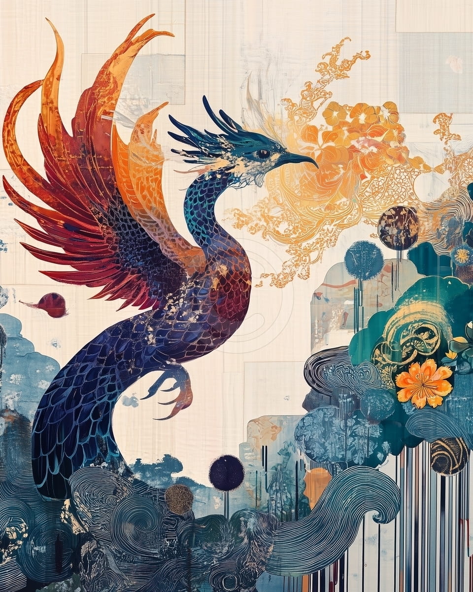 This vibrant painting portrays a phoenix rising from swirling clouds, its wings ablaze in fiery reds and oranges, while its body shimmers in deep blues and purples. The bird breathes out a magnificent burst of golden floral fire, where petals and flames intertwine in an ornate pattern. Stylized waves and celestial motifs in teal, indigo, and gold create a dreamlike atmosphere. The phoenix’s sharp beak, regal crest, and fierce posture symbolize power and renewal. The artwork beautifully blends traditional mythology with a contemporary, abstract aesthetic.