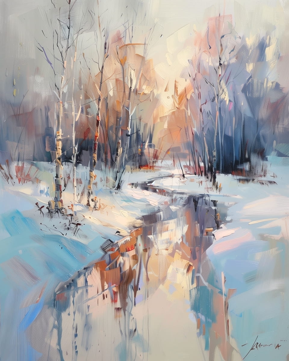 The painting depicts a winter forest with leafless trees and a narrow stream winding through the snow-covered ground. Soft morning light casts warm hues of gold, pink, and orange over the trees and reflects on the icy surface of the water. The brushstrokes are bold yet fluid, giving a sense of crisp air and quiet movement. The sky and snow blend into cool tones of blue and white, creating contrast with the warm center. The scene feels peaceful and fresh, capturing a fleeting sunrise in the cold.