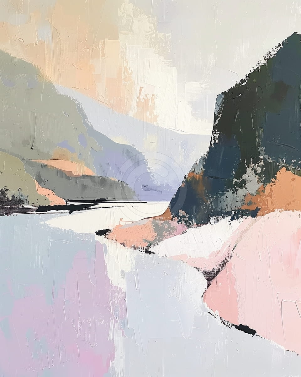 A minimalist landscape painting portraying a calm river winding through soft pastel-colored hills and cliffs. The serene atmosphere is captured with gentle strokes of muted pink, lavender, cream, and sage green. The abstracted mountains and water reflect an early morning light or a misty afternoon, evoking peace and introspection through simplicity and soft contrast.