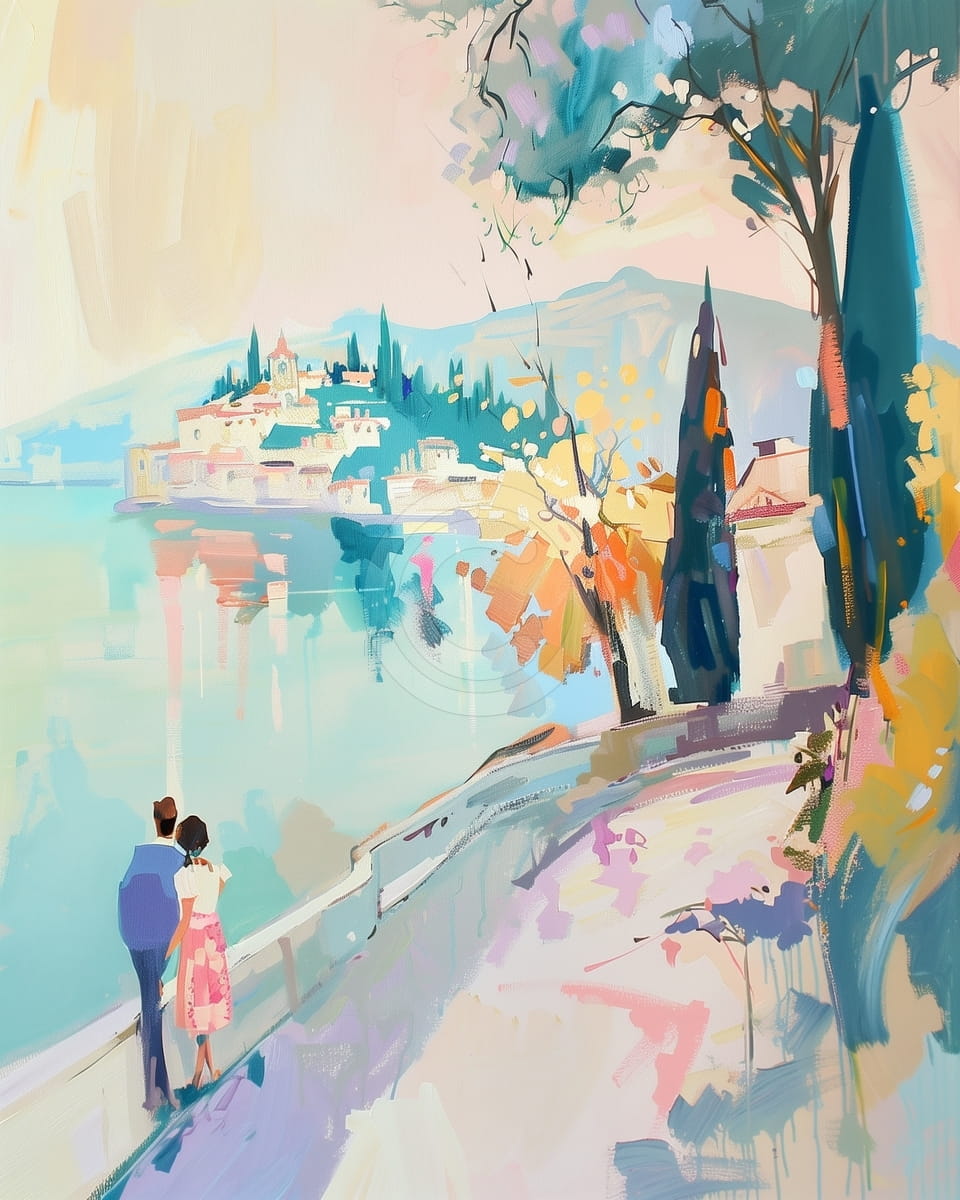 The painting shows a couple walking along a coastal path overlooking a tranquil bay and a charming village nestled on the water’s edge. The buildings, painted in soft pastel tones, are surrounded by tall cypress trees and distant mountains under a gentle sky. The brushstrokes are fluid and airy, creating a romantic and serene mood. The couple’s pose suggests closeness and peace as they enjoy the view together. The scene is warm, idyllic, and full of Mediterranean charm.