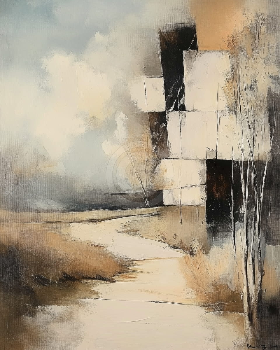 This painting blends abstract forms with a serene landscape, depicting a winding path that leads past geometric structures and delicate trees. The muted palette of beige, cream, and soft gray evokes calm and introspection. Bold black and ochre contrasts give the composition visual weight and structure. The brushstrokes are textured and expressive, enhancing the sense of movement and atmosphere. The interplay between nature and geometry suggests a dialogue between the organic and the constructed. This tablou adds a peaceful, contemplative touch to any modern space.