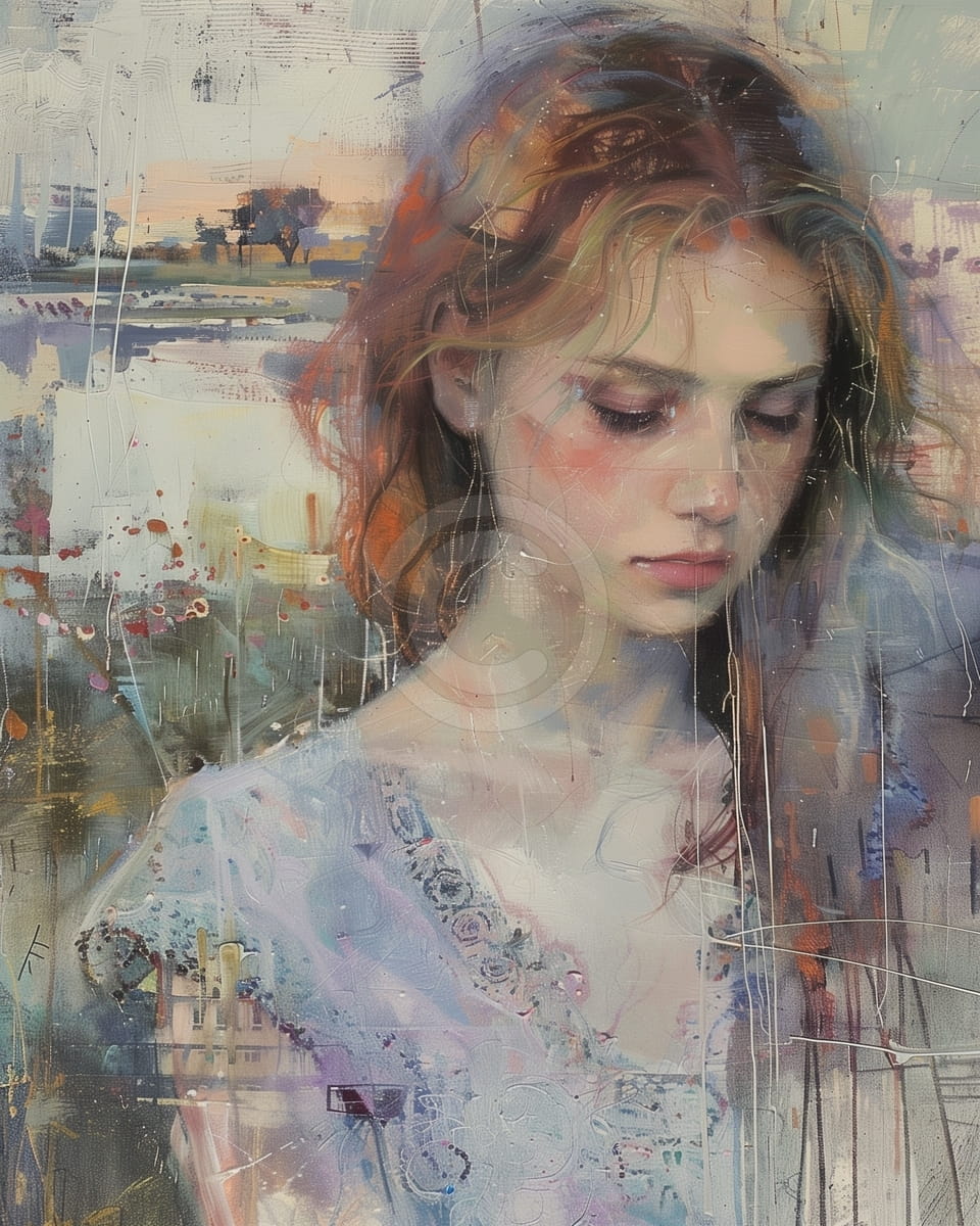 The painting depicts a young girl with red-blonde hair looking downward, her expression quiet and introspective. She wears a delicate, embroidered dress in pale tones of lavender and blue. The background is a blend of abstract textures and subtle landscapes, with soft strokes and scattered lines that give the piece a dreamy, layered feel. Light seems to gently filter through the composition, enhancing the emotional depth and vulnerability of the figure. The overall mood is one of stillness, sensitivity, and quiet reflection.