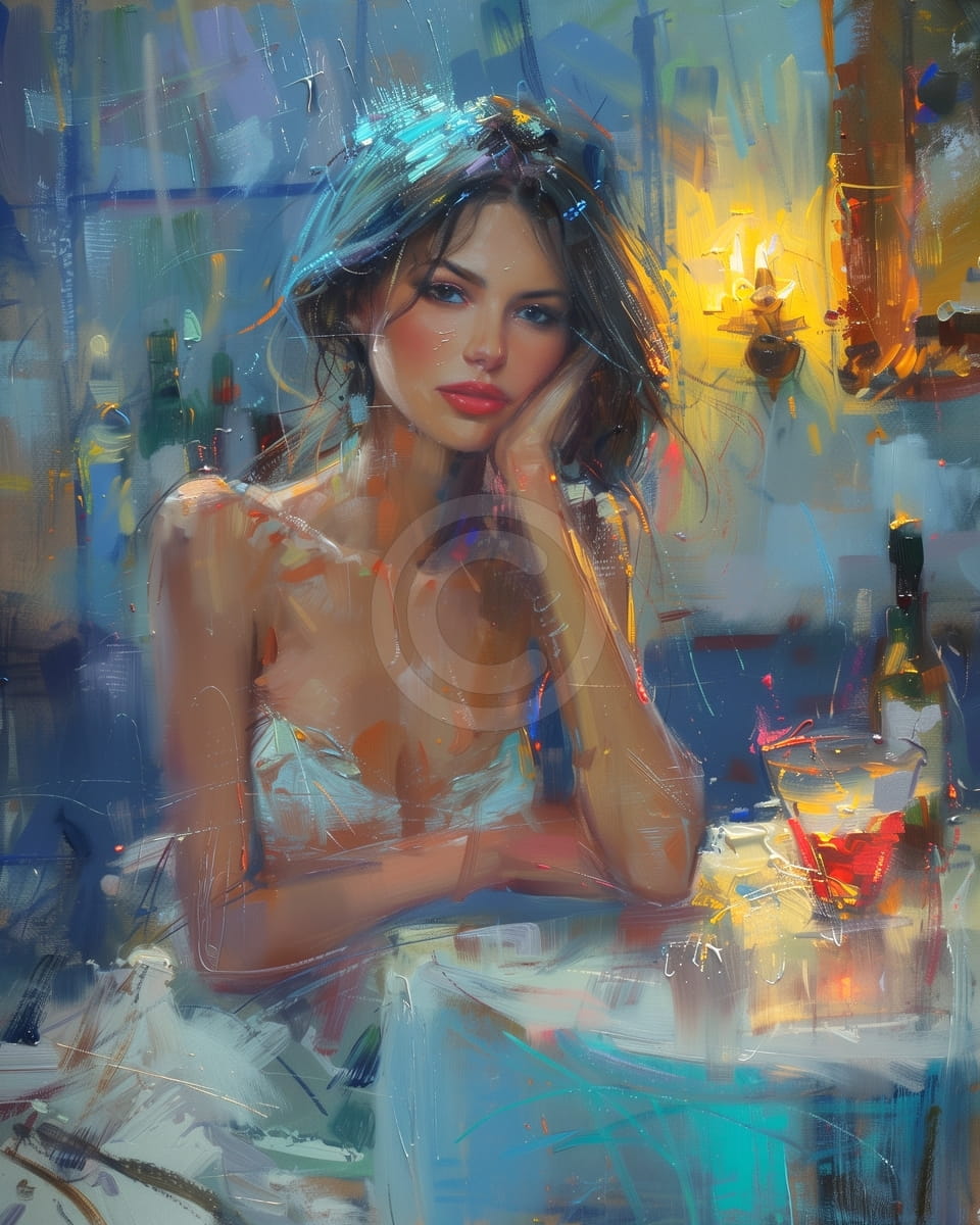 This atmospheric painting depicts a woman sitting alone at a table, leaning her face against her hand, her gaze thoughtful and slightly distant. She wears a light, elegant dress that glows under the warm, golden lamp behind her. The background features blurred shapes of bottles and walls bathed in soft blue and amber light. A glass of a vibrant red drink and a bottle rest on the table, adding a sense of quiet evening ambiance. The expressive brushstrokes and moody lighting evoke solitude, allure, and introspection.