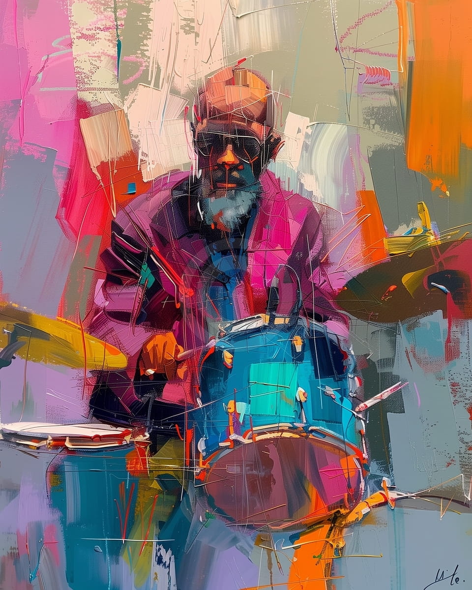This painting depicts a bearded man playing a drum kit, immersed in rhythm and surrounded by vivid, energetic brushstrokes. He wears sunglasses and a purple jacket, adding a sense of cool intensity. The drums are painted in shades of turquoise and orange, standing out against a layered abstract background filled with pinks, reds, oranges, and greys. The style combines expressionism and abstraction, capturing the movement and energy of live music through vibrant color and dynamic texture.