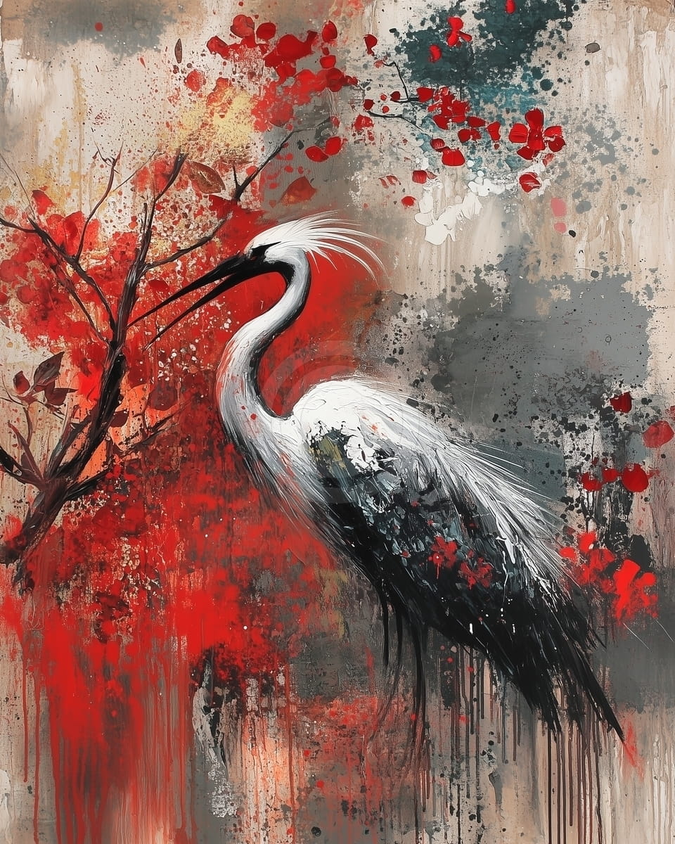 Esta pintura vibrante muestra una grulla blanca elegante de pie bajo un árbol florecido con intensas flores rojas. Sus alas negras y su postura refinada contrastan con las salpicaduras enérgicas de rojo, gris y beige que llenan el fondo. Las flores parecen estallar en el lienzo, aportando dinamismo y vitalidad a la escena. Las pinceladas texturizadas y la pintura goteada refuerzan el estilo crudo y expresivo de la obra. La composición mezcla serenidad con color y energía, celebrando la belleza natural y el simbolismo tradicional oriental.
