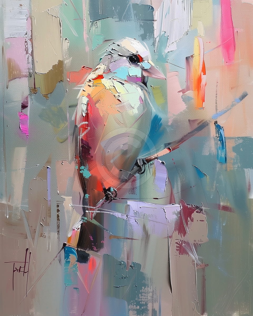 Este cuadro muestra un pájaro posado en una rama, formado con pinceladas gruesas y vibrantes en tonos de blanco, rojo, azul, naranja y lavanda. El fondo es abstracto, con bloques de color difusos en tonos pastel y vivos. El ojo del pájaro está claramente definido, captando la atención dentro de una composición suelta. La textura es rica y en capas, aportando profundidad y dinamismo al lienzo. La obra combina la forma natural con la abstracción expresiva.
