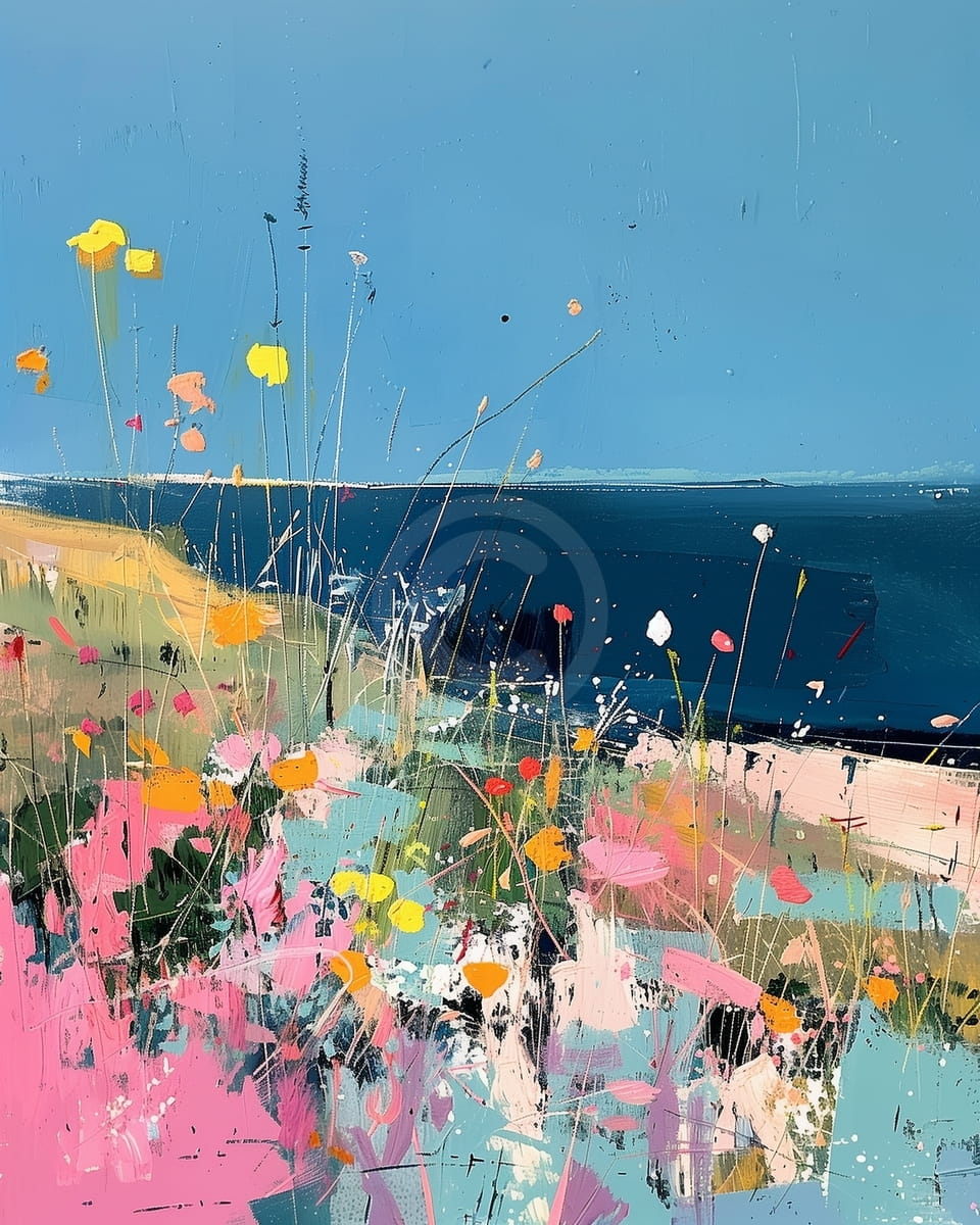 Este cuadro muestra un campo lleno de flores silvestres cerca del borde de un acantilado marino. Tallos altos y delicados con flores en rosa, amarillo, naranja y blanco se mecen en primer plano, mientras que el mar azul profundo se extiende en el horizonte. El cielo está claro y brillante, fundiéndose suavemente con el océano. Las pinceladas son dinámicas y espontáneas, aportando movimiento y luz a la escena. Salpicaduras de color vivas crean una atmósfera alegre y fresca. La composición celebra la belleza salvaje de la naturaleza junto al mar.