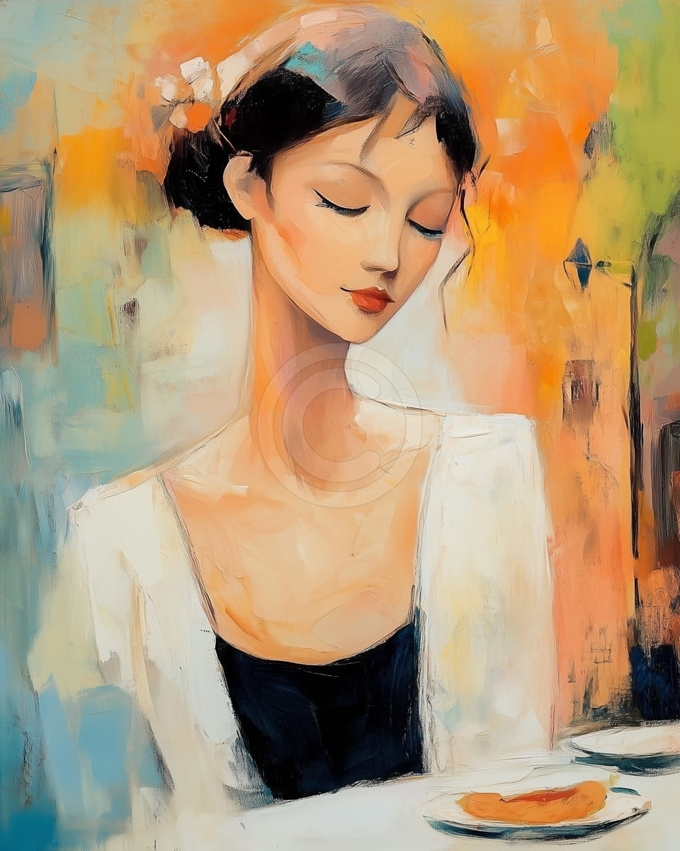 Este cuadro muestra a una mujer sentada con gracia en una mesa, con los ojos cerrados y la cabeza suavemente inclinada, en un momento de tranquilidad. Lleva un top negro con un cárdigan blanco, y suaves tonos anaranjados rodean su figura, fusionándose con un fondo abstracto y soñador. Un pequeño plato descansa frente a ella, sumando a la atmósfera serena y contemplativa. Las pinceladas son sueltas y fluidas, dando a la escena una cualidad suave, casi flotante, llena de calma y belleza tranquila.