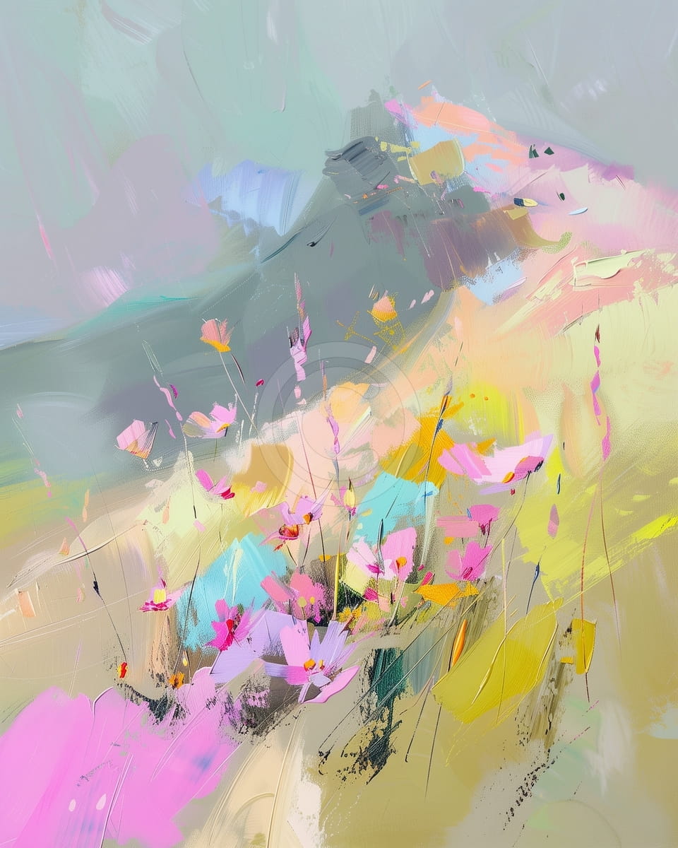 Ce tableau représente une scène vibrante de fleurs sauvages dispersées dans un champ abstrait aux tons doux. Les fleurs sont peintes en rose, violet et jaune, avec des tiges fines qui s’élèvent, donnant une impression de légèreté et de mouvement. L’arrière-plan se compose d’un mélange onirique de vert, turquoise, pêche et lavande. Les coups de pinceau expressifs et les superpositions apportent de la texture et de la profondeur. L’ensemble évoque la liberté, la couleur et la tranquillité de la nature.