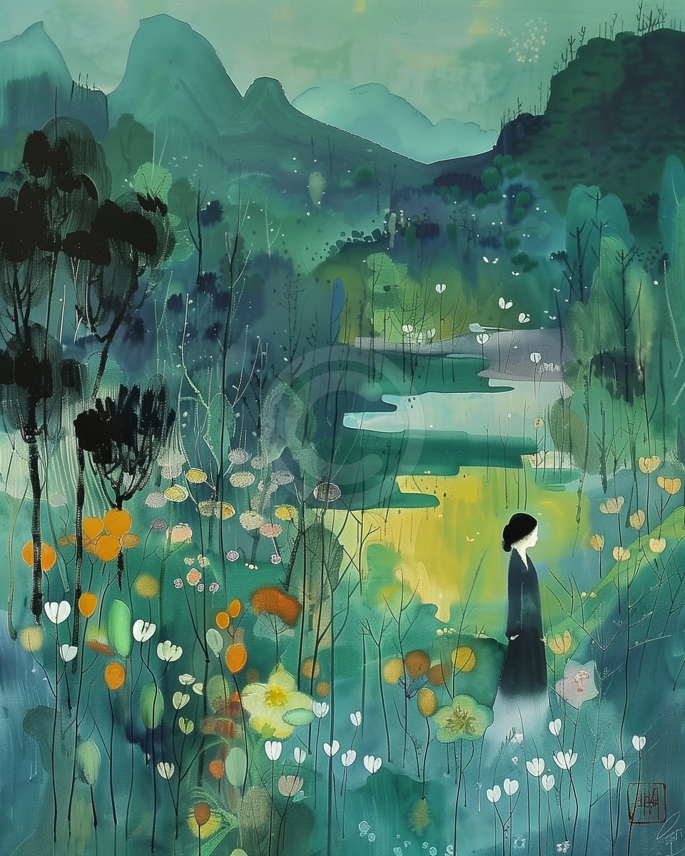 Ce tableau dépeint une scène paisible de vallée, dans des tons doux de vert et de bleu, avec une femme solitaire marchant à travers un champ de fleurs. Entourée de tiges fines et de fleurs blanches, orange et jaunes, la femme porte une robe sombre et avance calmement au cœur de la nature. Le paysage s’étend vers des collines embrumées et des étangs calmes, avec des montagnes au loin. Des lignes délicates et des textures proches de l’aquarelle accentuent l’ambiance onirique du décor. L’œuvre dégage une grande sérénité et une forte harmonie entre la figure et la nature.
