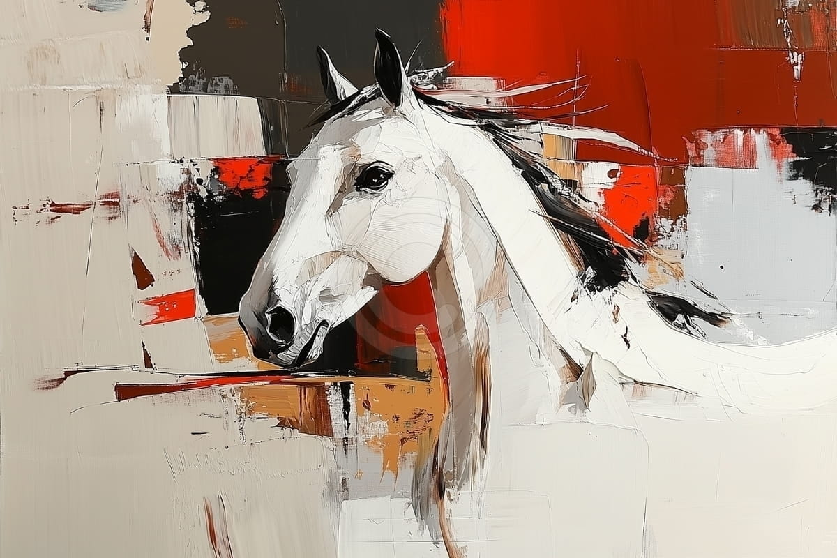 Ce tableau contemporain saisissant présente le profil majestueux d'un cheval blanc sur un fond dynamique et abstrait. La forme du cheval est rendue avec des coups de pinceau audacieux et expressifs, soulignant son cou puissant et sa crinière fluide d'un noir contrastant. L'arrière-plan est une composition vibrante de blocs de couleur texturés, dominée par des rouges riches, des noirs et diverses nuances de blanc et de gris, créant une sensation d'énergie et de mouvement. L'interaction de la forme élégante du cheval avec la toile de fond brute et picturale confère à l'œuvre une allure moderne et captivante.