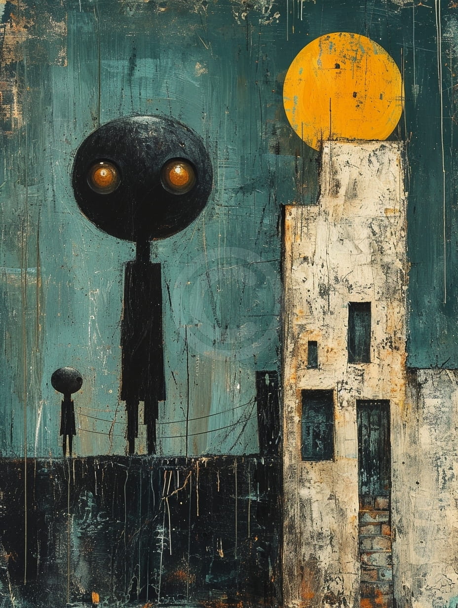 Ce tableau représente deux figures noires stylisées aux grandes têtes rondes et aux yeux brillants, debout sur un sol sombre. L’une est nettement plus grande que l’autre, évoquant un adulte et un enfant. À droite, un grand bâtiment blanc texturé avec plusieurs fenêtres et une porte. Un grand cercle jaune, peut-être la lune ou le soleil, domine le ciel bleu foncé. La surface est marquée par des rayures, des coulures et des signes abstraits. L’ambiance générale est mystérieuse et surréaliste, avec un silence étrange.