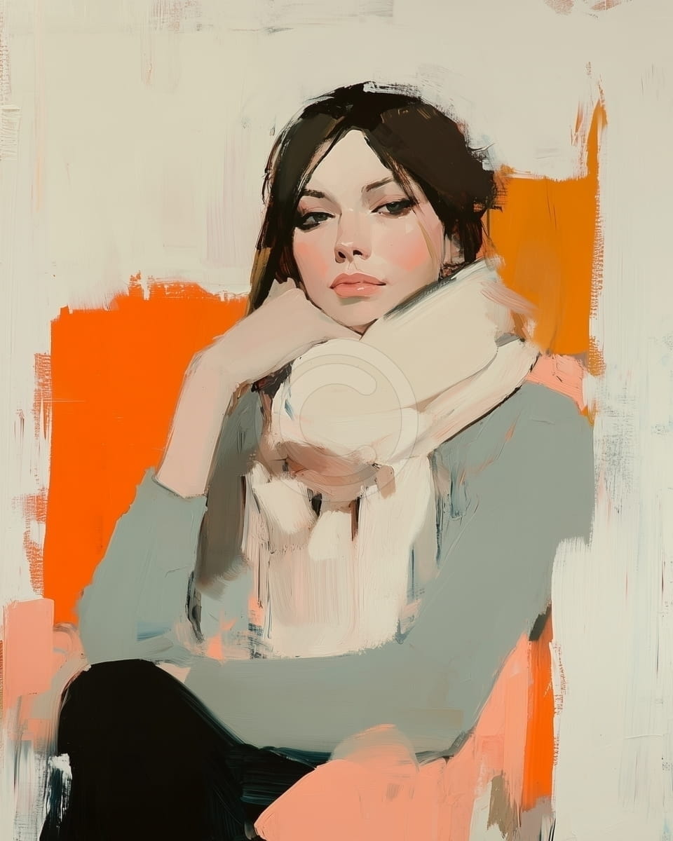 Ce tableau saisissant représente une femme dans une pose contemplative, le menton délicatement posé sur sa main. Elle est dépeinte avec des cheveux foncés et une douce écharpe blanche drapée autour de son cou, suggérant un sentiment de confort et d'introspection. L'arrière-plan présente des blocs abstraits audacieux d'orange vibrant et de subtiles nuances de blanc cassé, créant un contraste dynamique qui met en valeur la figure. Le style pictural, caractérisé par des coups de pinceau visibles, ajoute de la texture et une qualité expressive à l'œuvre, soulignant son humeur pensive.