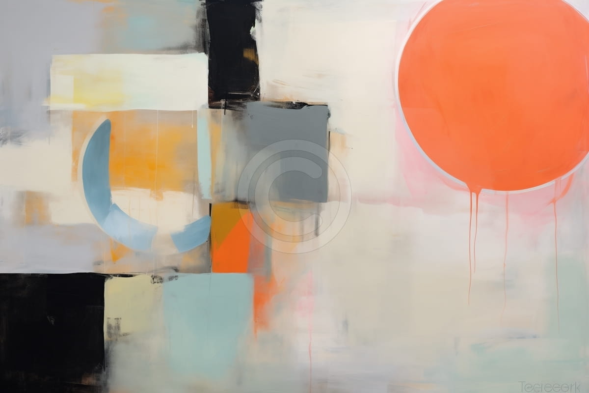 Questo quadro presenta una composizione astratta con un grande cerchio arancione sul lato destro, con leggere colature verso il basso. A sinistra, una mezzaluna blu è inserita tra blocchi sovrapposti di arancione, grigio, nero e acquamarina chiaro. Lo sfondo è una miscela sfumata di toni crema e chiari. Le forme sono geometriche ma irregolari, con trame e segni di pennello visibili. Il contrasto tra colori caldi e freddi crea tensione visiva in una composizione equilibrata.