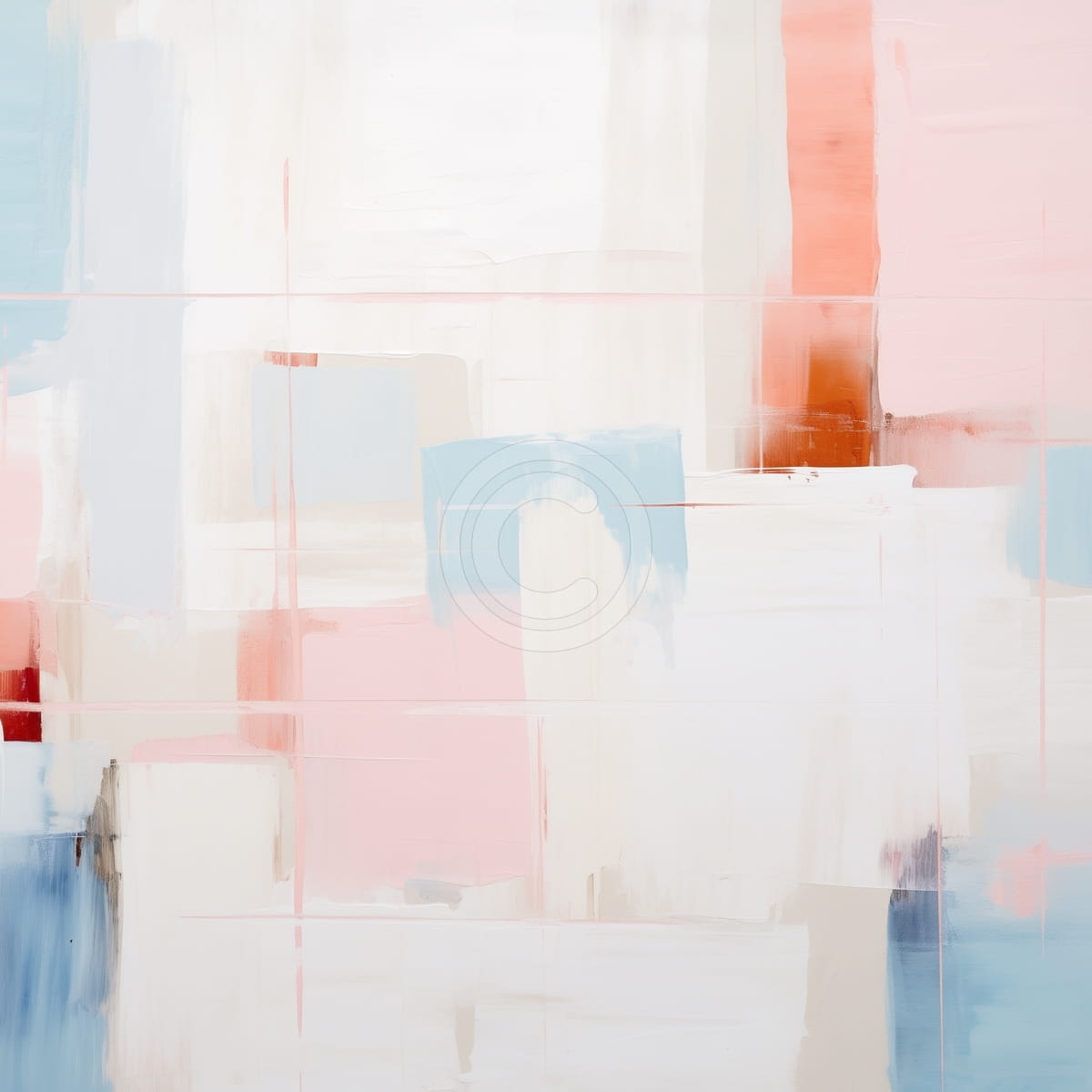 Questo quadro presenta una griglia astratta e morbida composta da rettangoli sovrapposti in rosa chiaro, azzurro cielo, bianco, beige e tocchi di terracotta. Sottili linee verticali e orizzontali in rosso pallido danno una struttura delicata alla composizione. I colori sono stesi con pennellate morbide, creando un’atmosfera calma e ariosa. Alcune sezioni si sfumano tra loro, mentre altre mantengono bordi netti. L’insieme risulta aperto ed equilibrato.