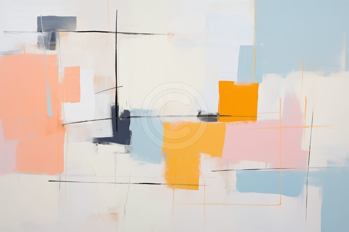 Questo quadro mostra una disposizione astratta di campi rettangolari di colore e linee sottili su uno sfondo crema chiaro. I toni dominanti sono arancione, pesca, rosa tenue, azzurro e grigio scuro. La composizione è attraversata da sottili linee nere e arancioni che creano una struttura a griglia che equilibra le pennellate libere. L’uso di tinte morbide e vivaci dona calma ed energia. L’impostazione è aperta e ariosa, offrendo un senso di luce e spazio.