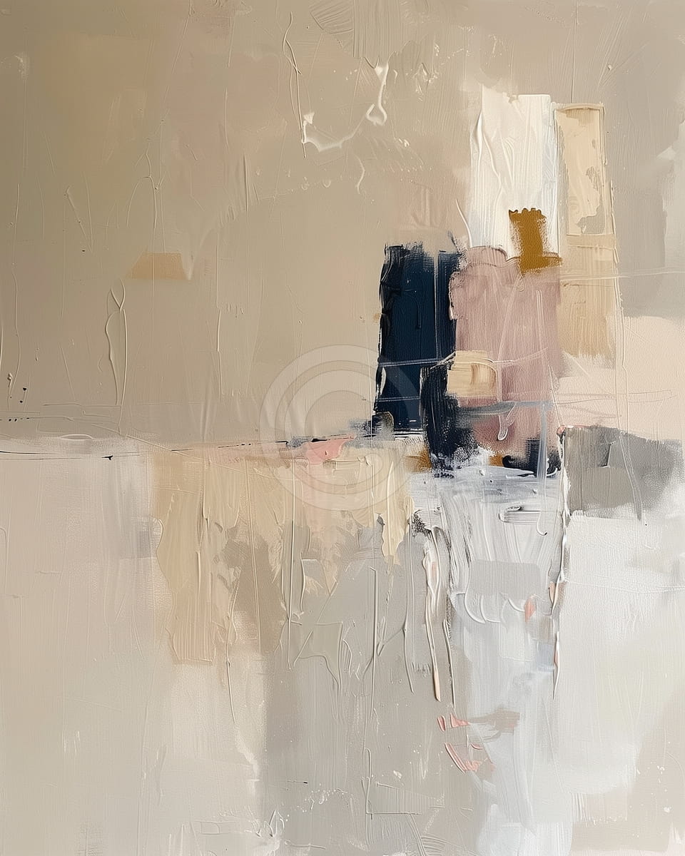 Questo quadro astratto utilizza una tavolozza delicata di beige, crema, tortora e bianco, con accenti di blu navy, rosa antico e ocra. La pittura spessa e le texture a pennello visibili danno alla superficie un aspetto materico. La composizione è centrata su un gruppo verticale di forme, mentre lo spazio circostante rimane calmo e aperto. Lievi linee orizzontali e sovrapposizioni suggeriscono movimento. L’opera trasmette quiete ed equilibrio, invitando alla contemplazione attraverso un’eleganza minimalista.