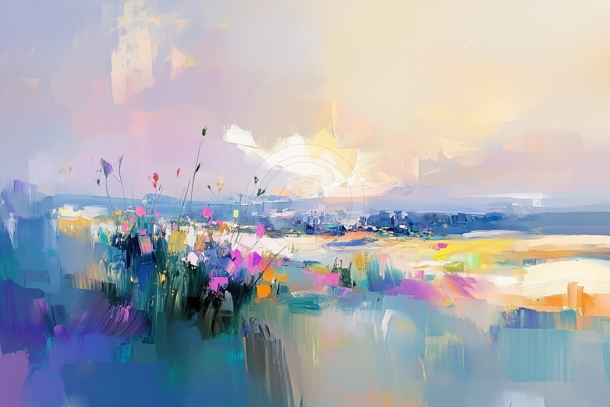 Questo quadro astratto cattura un paesaggio vibrante e impressionistico con una qualità morbida ed eterea, che ricorda un campo fiorito sotto un cielo pastello. Il primo piano è un ricco arazzo di blu profondi, verdi e pennellate prominenti di rosa brillante e viola, che suggeriscono un campo di fiori selvatici o una vegetazione lussureggiante. Linee sottili e delicate si ergono da questa distesa colorata, accennando a singoli steli di fiori. Nel mezzo, forme astratte in blu e grigi suggeriscono un paesaggio urbano o una massa terrestre distante, fondendosi in un orizzonte di luce soffusa. Il cielo è una miscela di giallo pallido, rosa e azzurro, che evoca il dolce bagliore dell'alba o del tramonto.