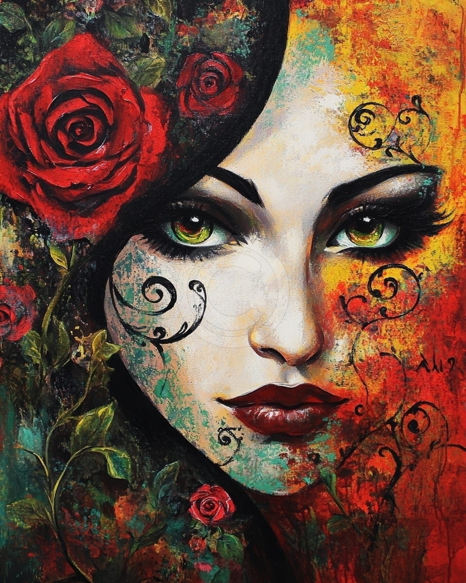 Questo quadro vibrante presenta una donna affascinante con occhi penetranti e labbra rosse seducenti. Rose rosse lussureggianti adornano i suoi capelli scuri, completando le ricche e calde tonalità dello sfondo. Delicate volute ornamentali impreziosiscono con grazia il suo viso e si fondono con le trame astratte. La composizione crea un senso di mistero e fascino, attirando lo spettatore in un mondo di bellezza ed emozione.