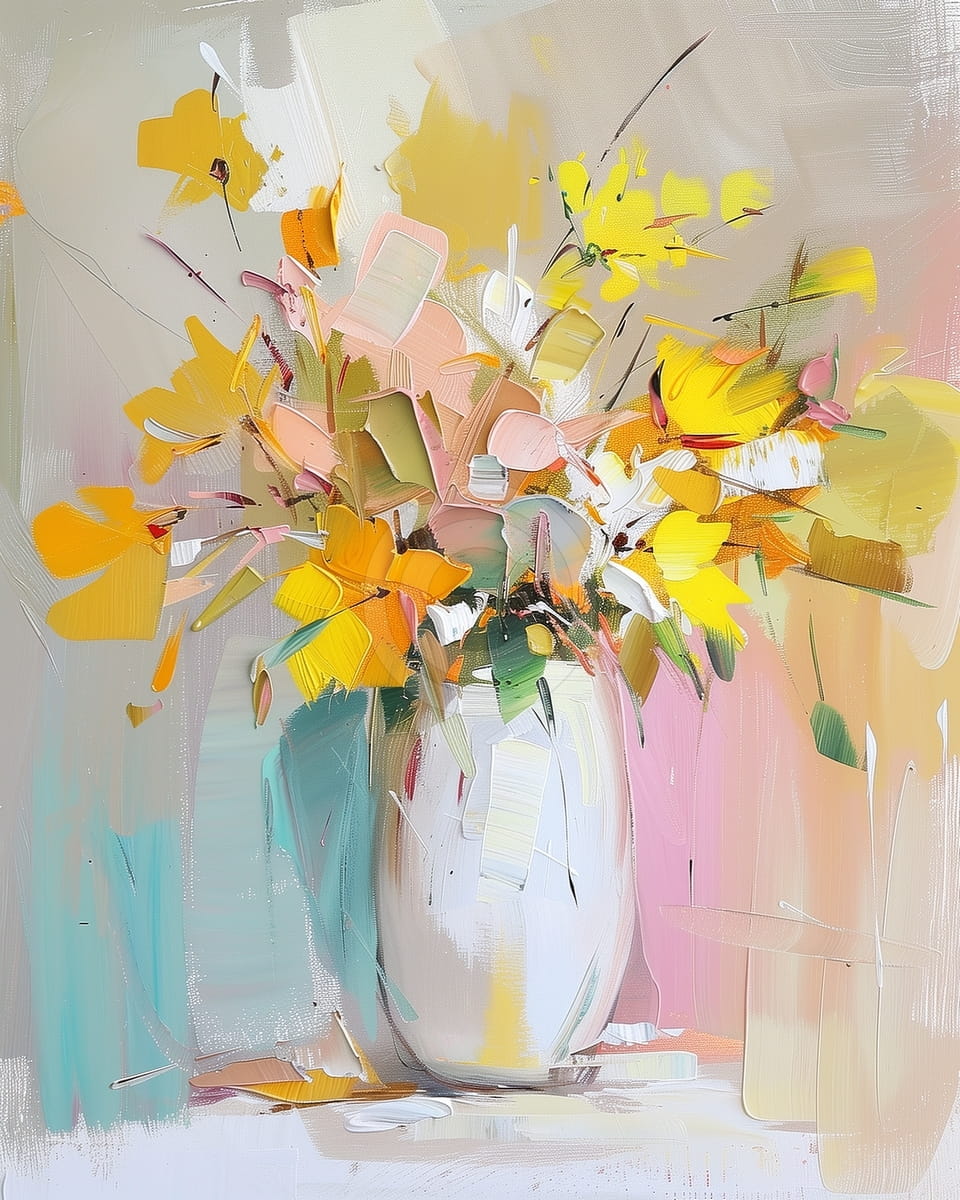 Questo quadro raffigura un vivace bouquet di fiori in tonalità di giallo, arancione, rosa e bianco, disposti in un alto vaso bianco. I petali e le foglie sono dipinti con pennellate decise e materiche, che donano movimento ed energia alla composizione. Lo sfondo mescola toni pastello come verde acqua, pesca, beige e rosa tenue, creando un’atmosfera vivace e ariosa. La pennellata è espressiva e spontanea, aggiungendo profondità e consistenza. L’effetto complessivo è allegro e pieno di vita.