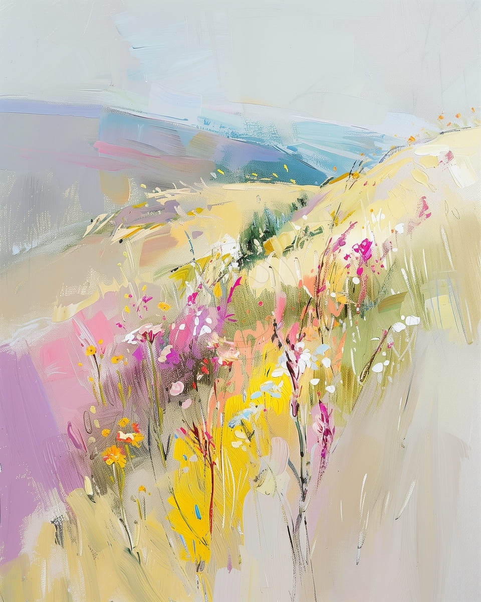 Questo quadro raffigura un pendio illuminato dal sole ricoperto di fiori selvatici in fiore. Fiori gialli, rosa, bianchi e arancioni si spargono lungo una dolce collina, con pennellate morbide che suggeriscono il movimento tra le erbe alte. Sullo sfondo si vedono colline ondulate in tonalità pastello di blu, violetto e beige che si fondono con un cielo chiaro. L’atmosfera è calda e ariosa, evocando una tranquilla giornata estiva in campagna. Lo stile astratto esalta la freschezza e la spontaneità della scena.