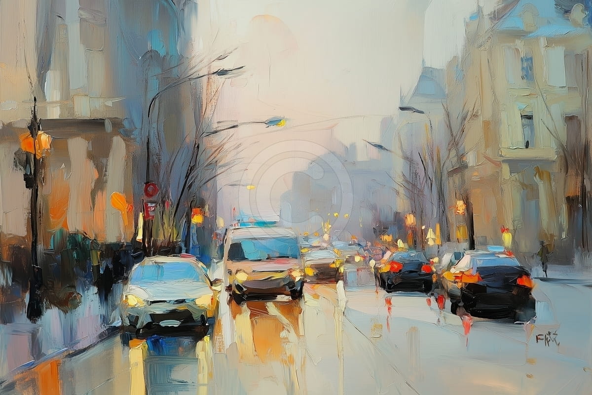 Questo quadro raffigura una strada cittadina affollata in un giorno di pioggia, con le auto che si muovono lentamente sotto una luce soffusa e nebbiosa. I riflessi dei fari e dei lampioni brillano sull’asfalto bagnato, aggiungendo calore ai toni freddi degli edifici e del cielo. I veicoli sono dipinti con tratti sciolti ed espressivi, mentre alberi spogli e architetture classiche incorniciano la scena. L’atmosfera è urbana e malinconica, evocando un senso di movimento silenzioso e ritmo quotidiano in un contesto metropolitano.