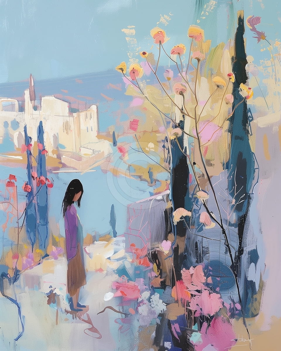 Il quadro mostra una ragazza dai capelli scuri che sta in piedi in silenzio in un giardino pieno di fiori colorati e piante alte. Sullo sfondo, si intravedono sagome morbide di edifici su un paesaggio azzurro sotto un cielo luminoso. I fiori sono dipinti in tonalità di rosa, giallo e rosso, mentre la vegetazione e lo sfondo presentano colori pastello e azzurri. La postura della ragazza è calma e riflessiva, conferendo alla scena un’atmosfera tranquilla e pensierosa. Le pennellate sono fluide ed espressive, fondendo natura e architettura in modo sognante.