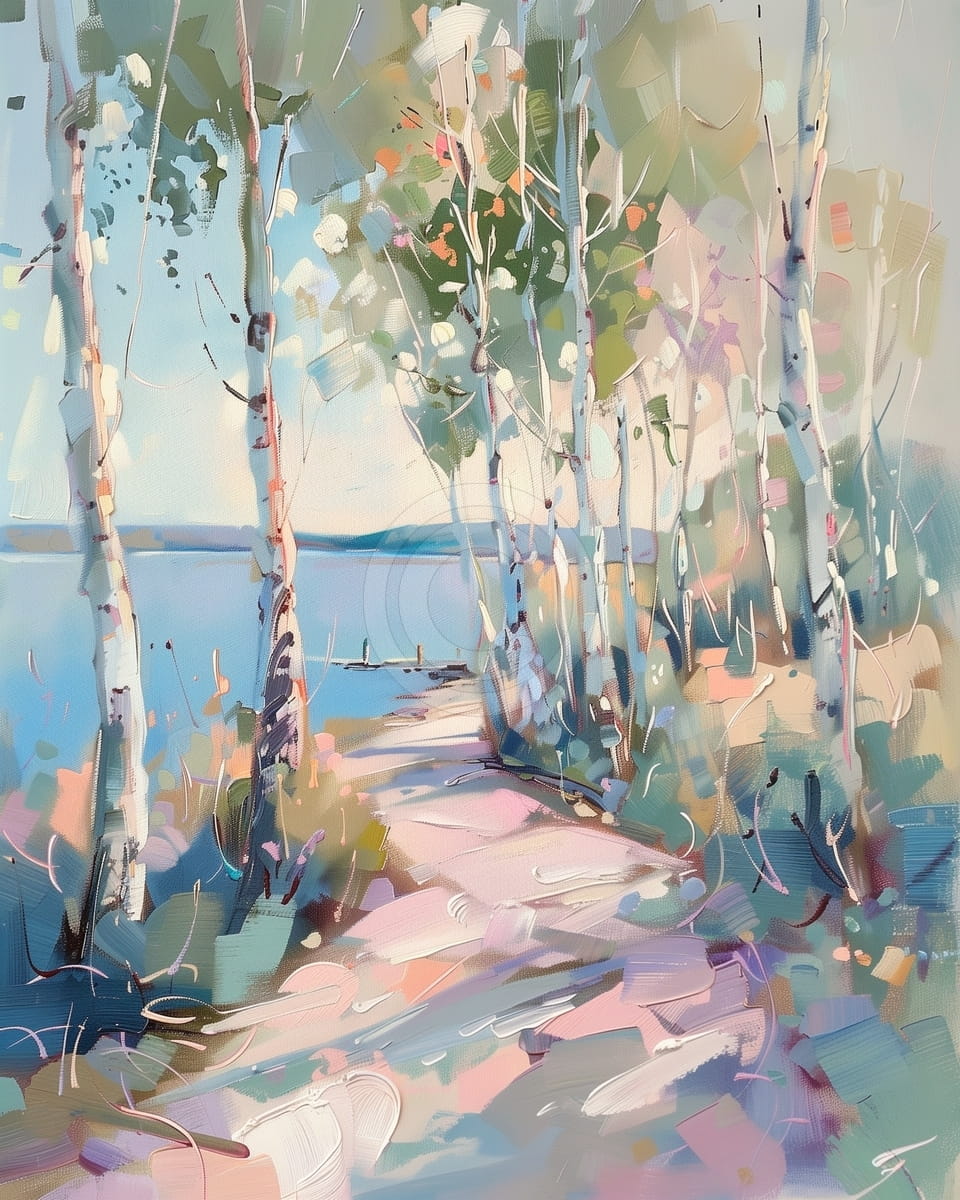Il quadro mostra un sentiero illuminato dal sole che si snoda dolcemente tra un boschetto di betulle, conducendo a un lago calmo e blu. I tronchi delle betulle sono alti e sottili, con la luce che filtra tra foglie verdi e pastello. Il terreno è dipinto con pennellate morbide e stratificate in rosa, blu e bianco, creando una texture onirica e quasi astratta. La composizione è luminosa e tranquilla, e cattura la freschezza di una passeggiata nella natura vicino al lago.
